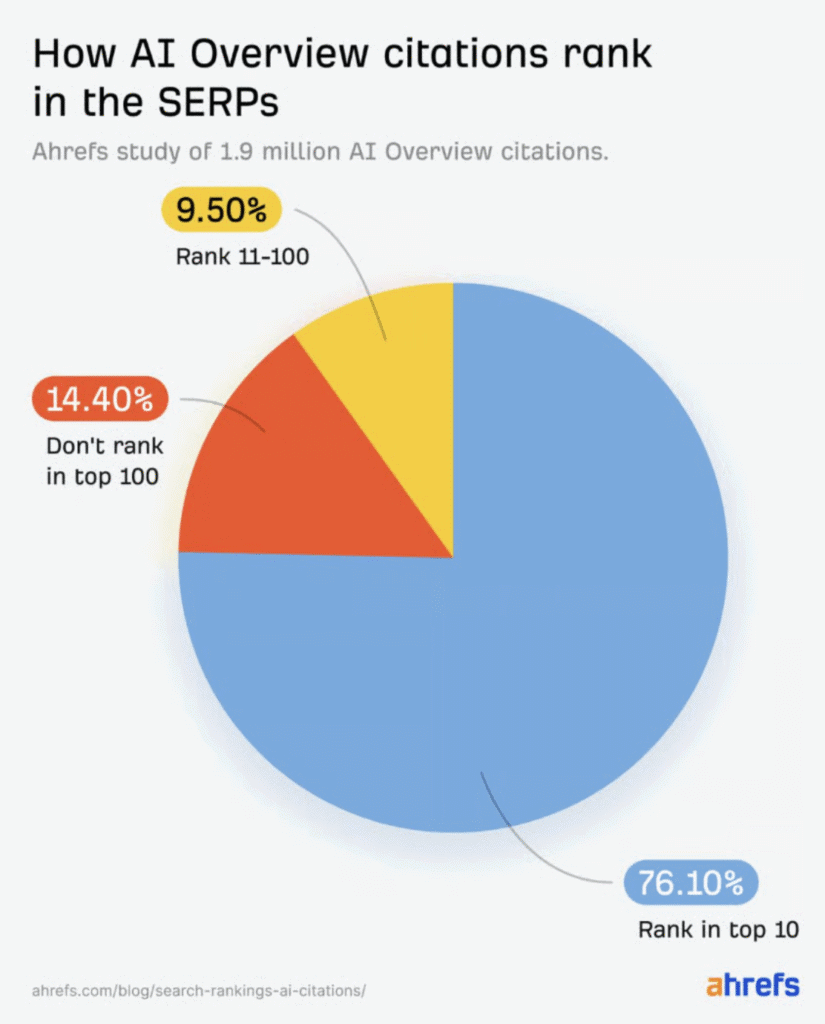 Out of 1.9 million AI overview citations processed, they found 76.10% of citations were from content ranking in the top 10 spots on Google.