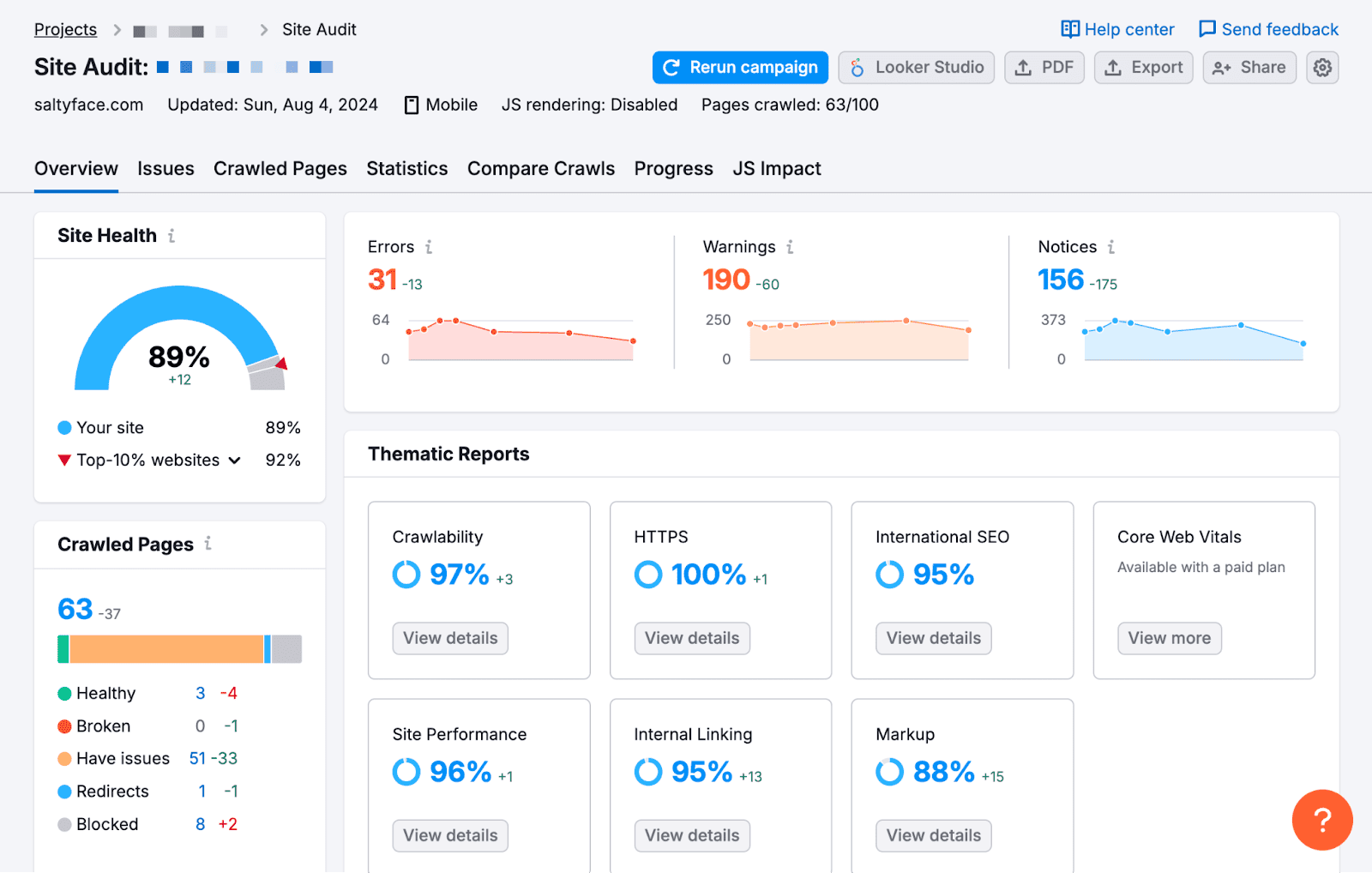 Just input your domain and after the audit is done, you’ll see a full dashboard with your site health score, errors, warnings, and other vital SEO metrics.