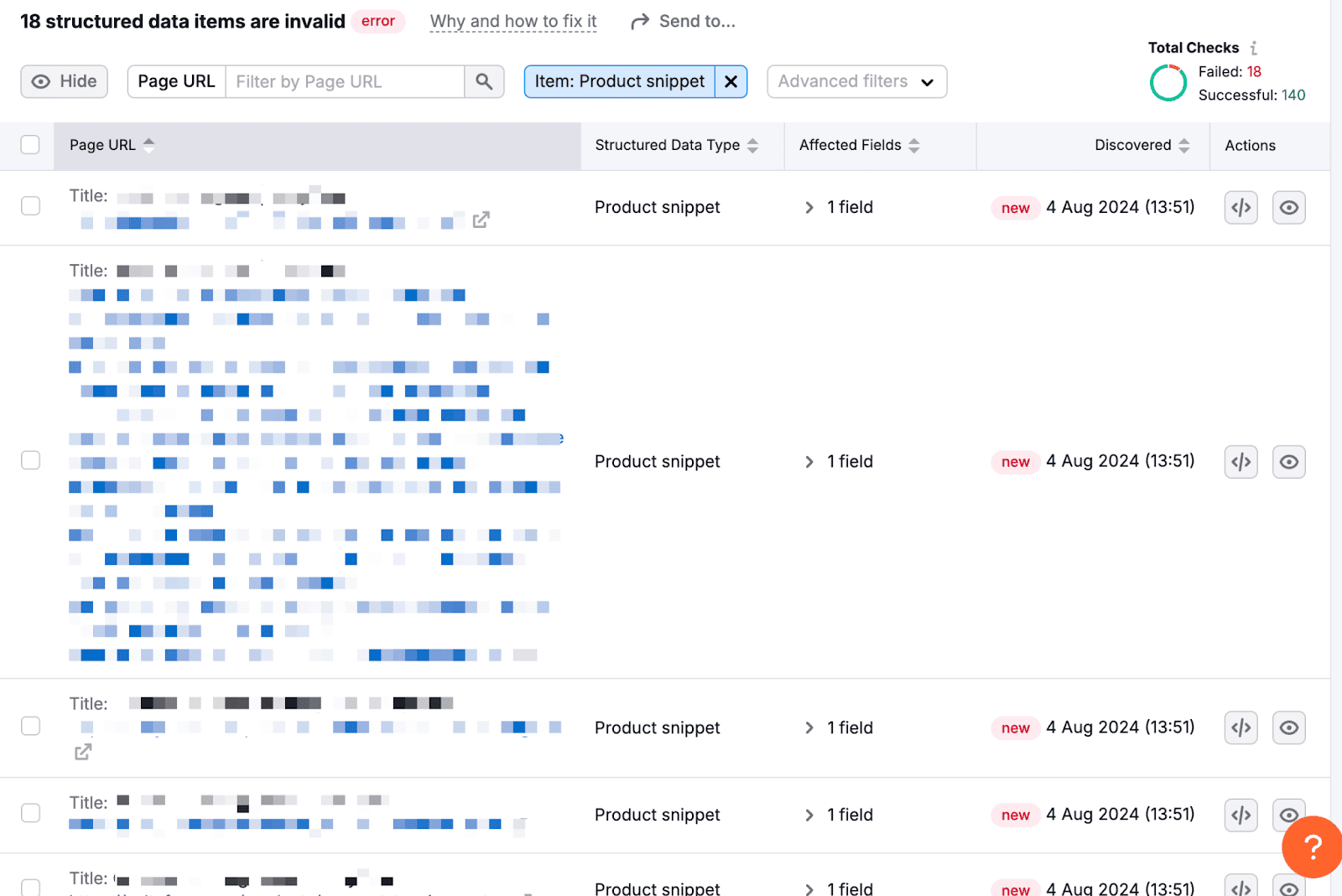 At the bottom, you’ll find the Structured Data Items chat – this shows all of the structured data items discovered on your website. The list is sorted based on the number of pages with invalid items.